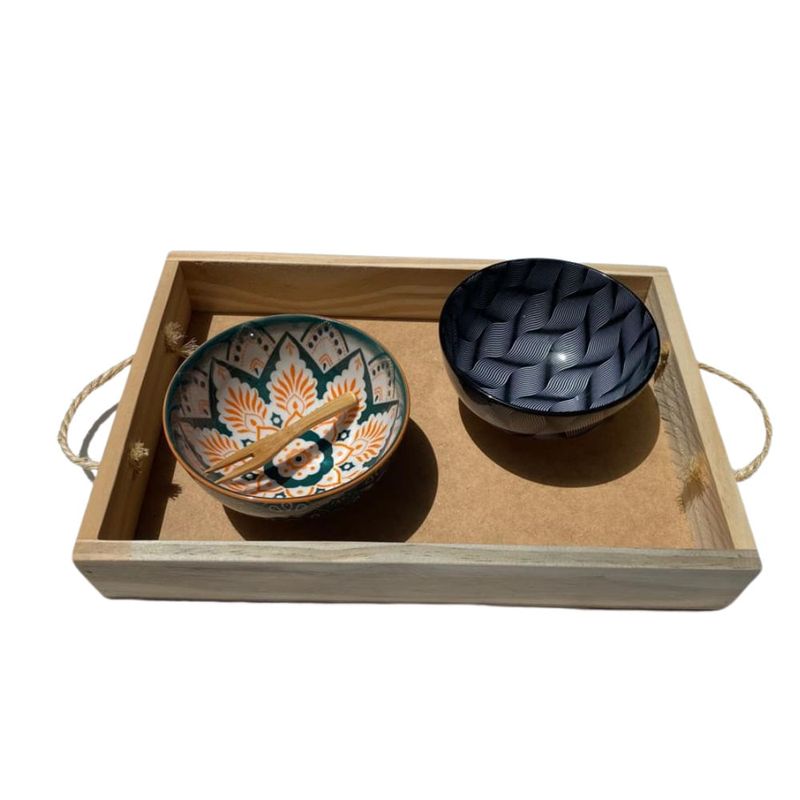 Linda Bandeja rustica de madeira com pegadores em corda